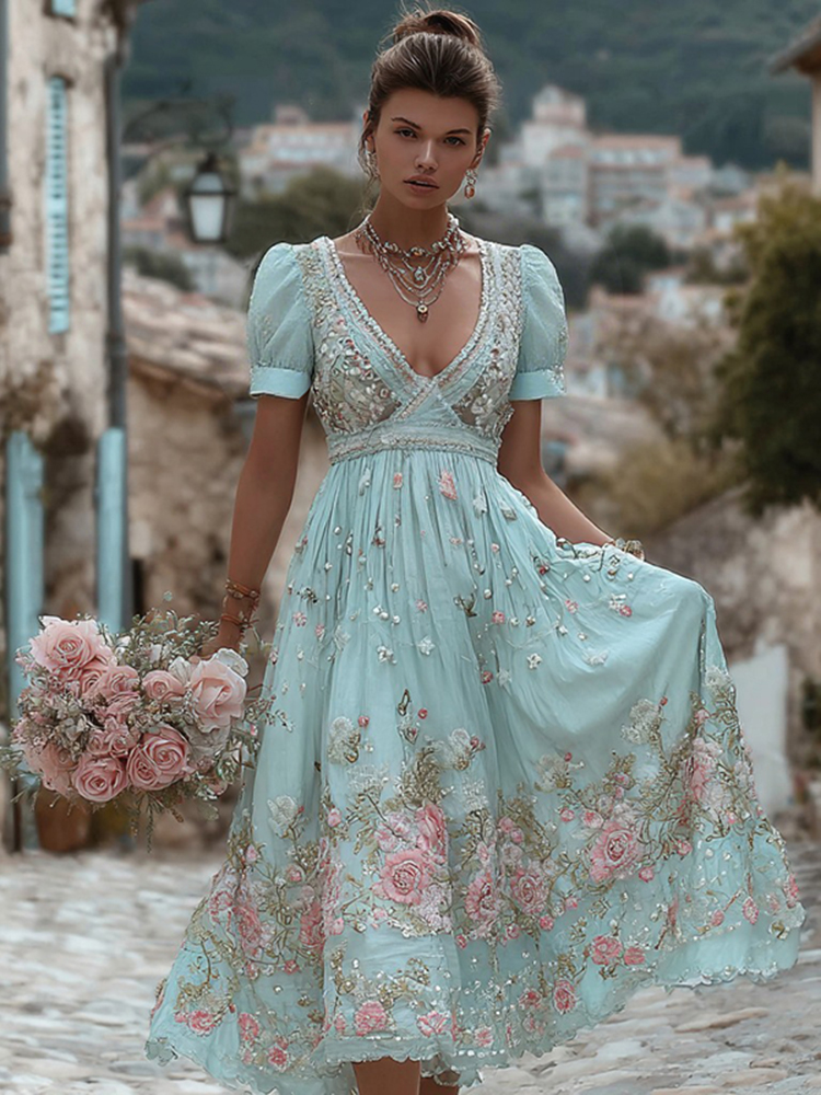 Vintage Floral Embroidery Short-sleeved Dress