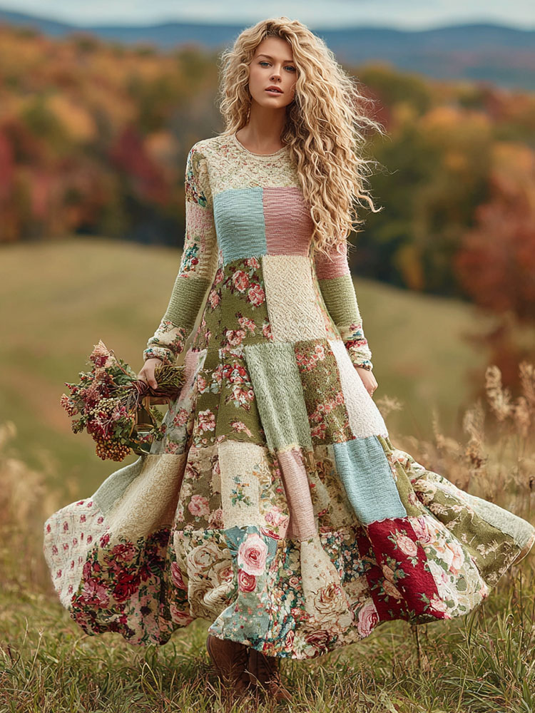 Women’s Vintage Floral Patchwork Art Cozy Knit Maxi Sweater Dress