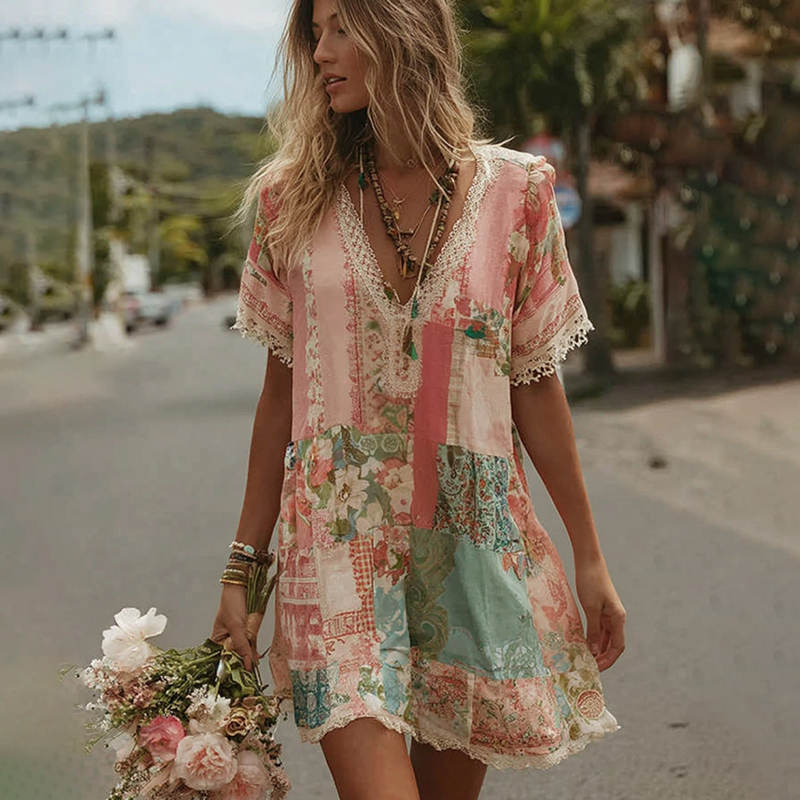Women’s Vintage Floral Patchwork Art Pattern Short Sleeve Mini Dress
