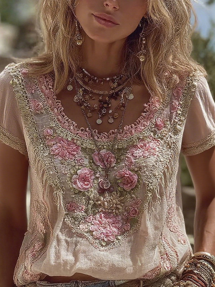 Women’s Floral Embroidered Art V-neck Short Sleeved Linen Blend T-shirt