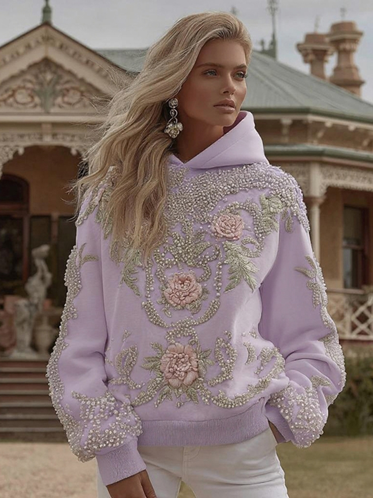 Women’s Vintage Flower Embroidery Art Long Sleeve Casual Hoodie