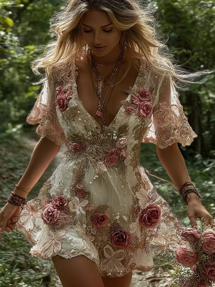 Women’s Vintage Flowers Embroidery Art Short Sleeves Mini Dress