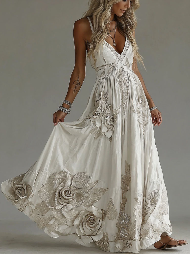 Women’s Vintage Flowers Embroidery Art V-neck Suspender Maxi Dress