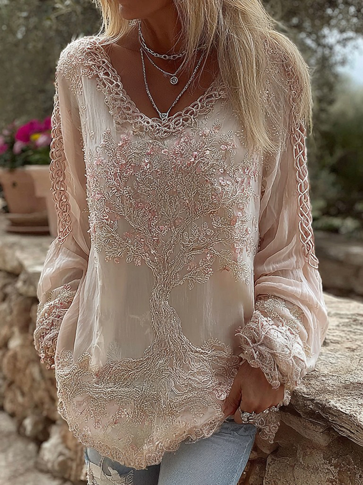 Bohemian-style Pink Floral Embroidery V-neck Short-sleeved Shirt With Sequins