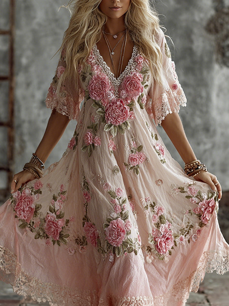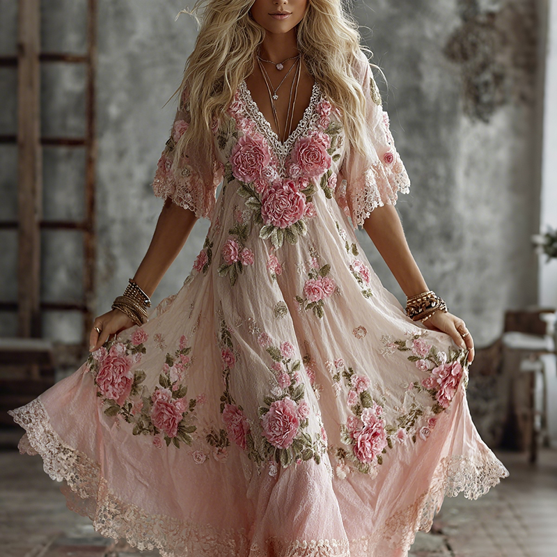 Women’s Vintage Pink Floral Art Embroidered Flowy Maxi Dress
