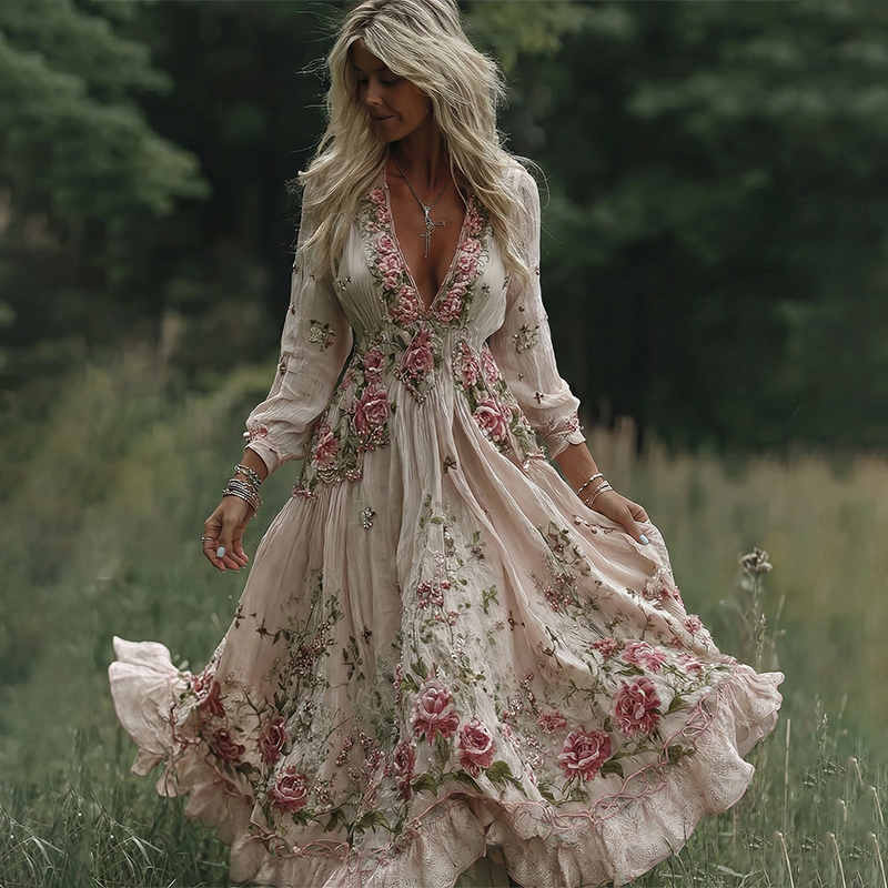 Women’s Vintage Rose Embroidery Art Comfy Linen Maxi Dress