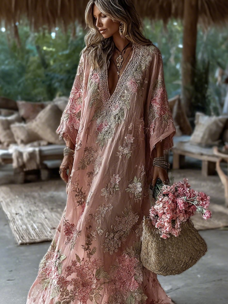 Women’s Vintage Pink Floral Art V Neck Long Sleeve Maxi Dress