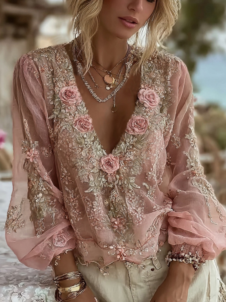 Women’s Vintage Pink Floral Embroidered Art V-neck Long Sleeve Linen Blend Blouse