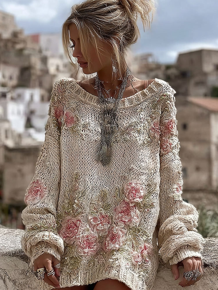 Women’s Vintage Pink Flowers Art Cozy Knit Pullover Mini Sweater Dress