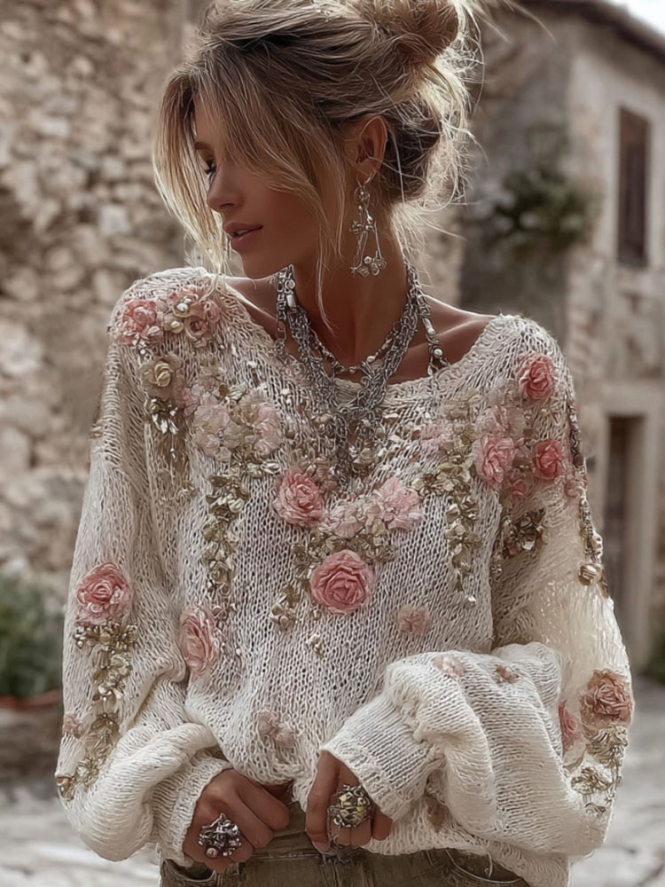 Women’s Vintage Pink Flowers Art Cozy Knit Pullover Sweater
