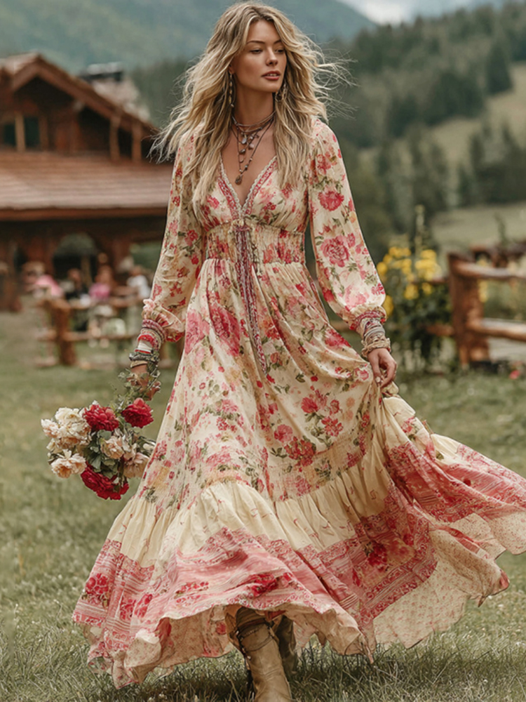 Vintage Boho Roses Embroidered Flowy Linen Maxi Dress