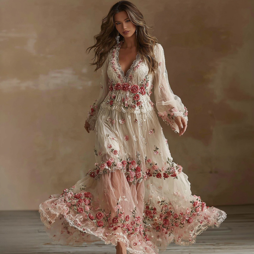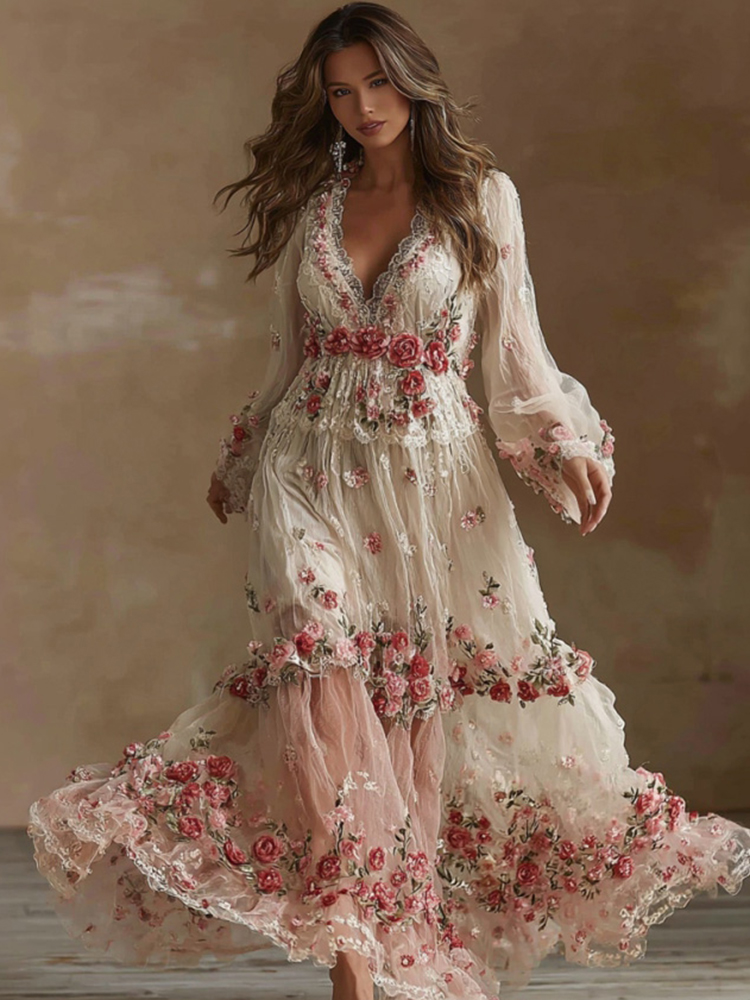 Women’s Vintage Pink Rose Embroidered Linen Blend Dress