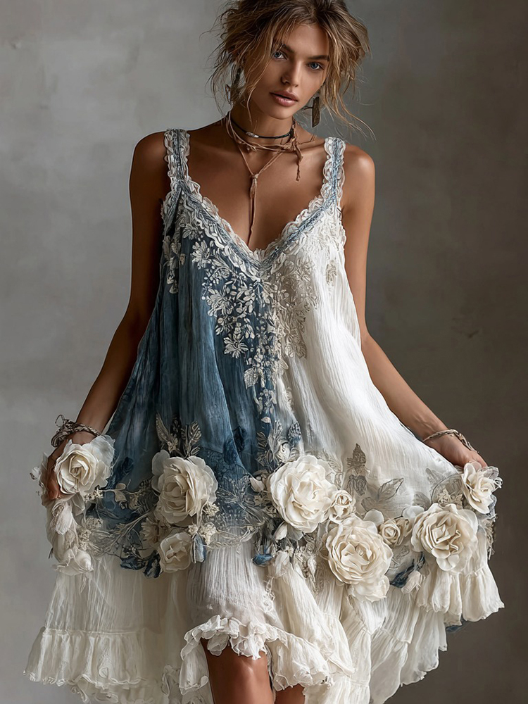 Vintage Boho Roses Embroidered Flowy Linen Maxi Dress