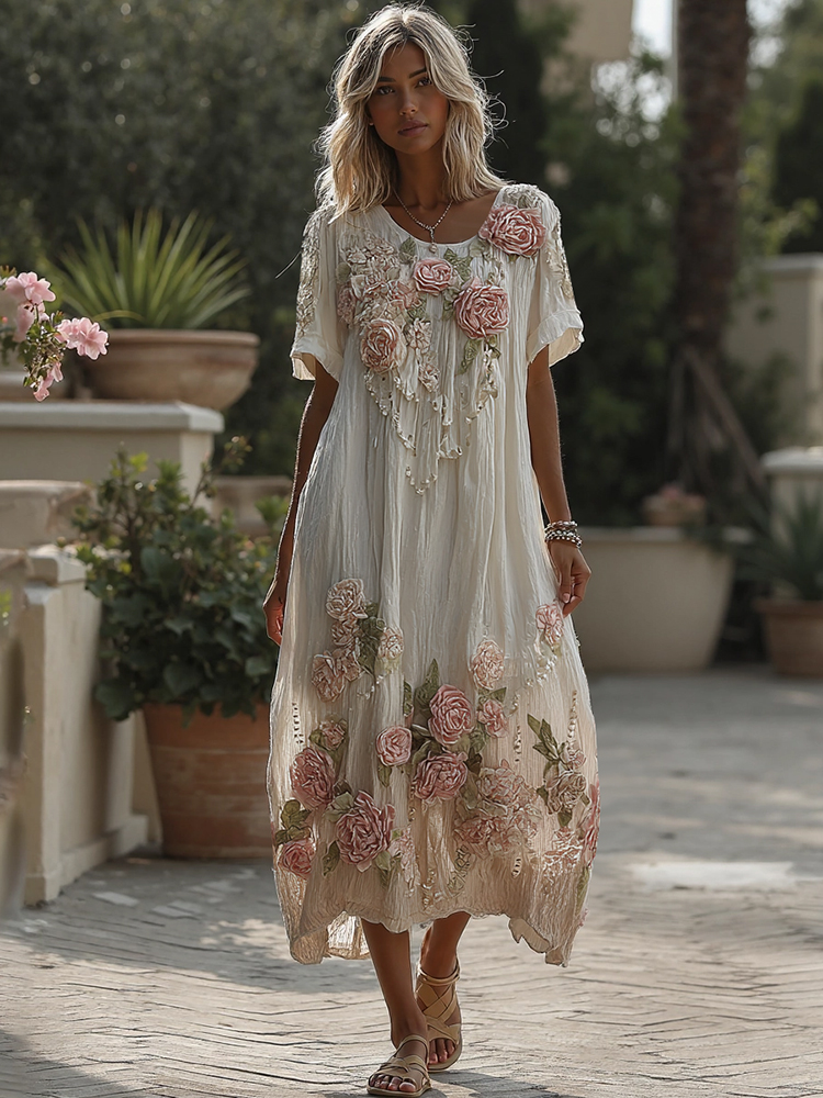 Women’s Vintage Rose Embroidery Art Comfy Linen Maxi Dress