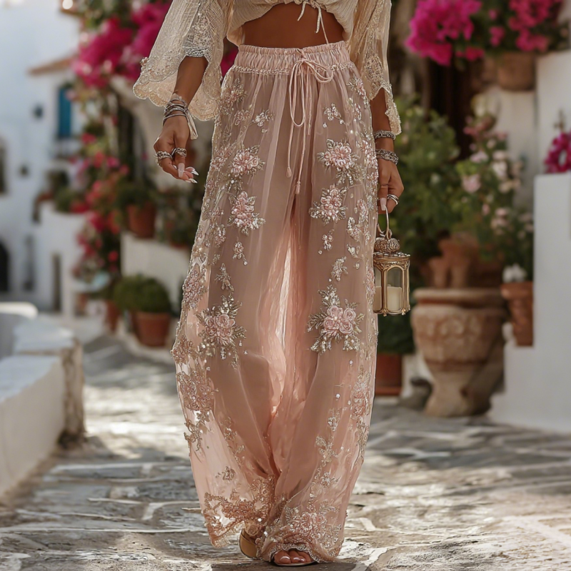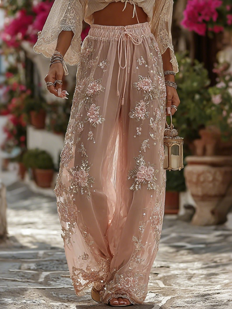 Love & Health Collection Retro Rose And Floral Patchwork Art Linen Pants