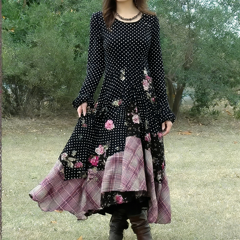 Women’s Vintage Polka Dot And Rose Floral Plaid Patchwork Linen Dress