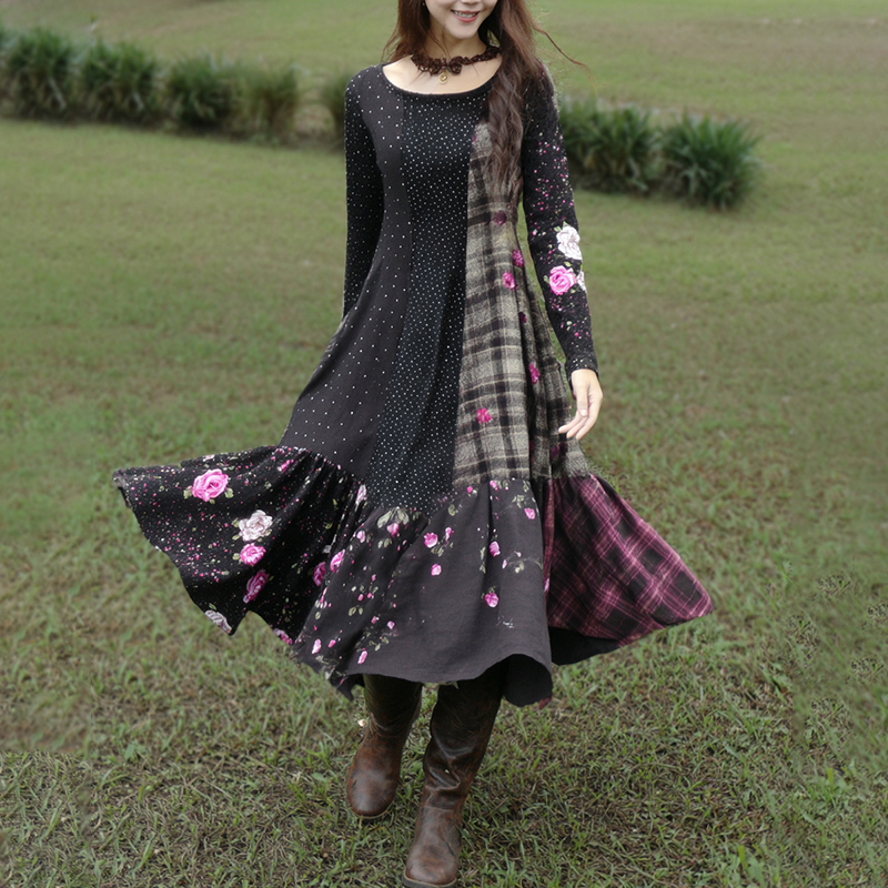 Women’s Vintage Polka Dot And Rose Floral Plaid Patchwork Linen Dress