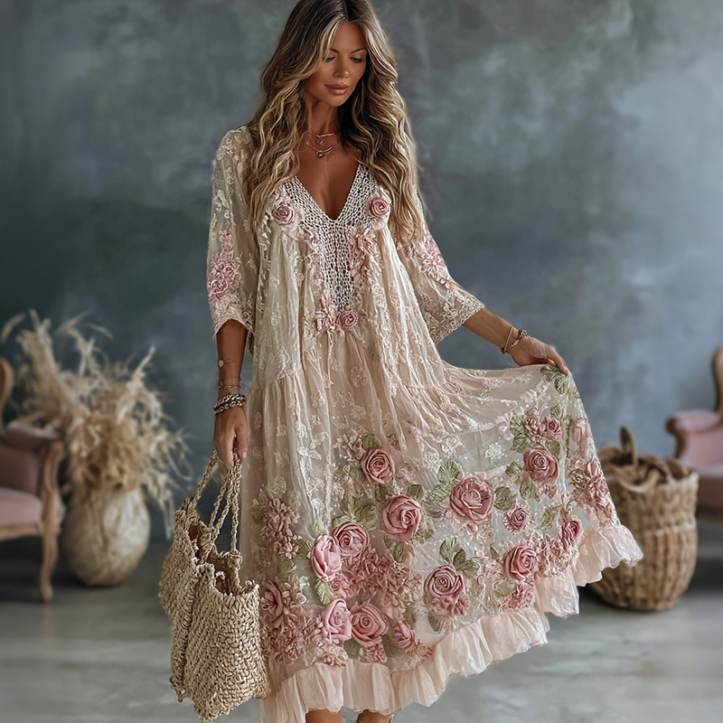 Women’s Vintage Pink Floral Embroidered Art V-neck Long Sleeve Blouse