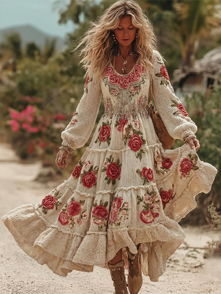 Women’s Vintage Romantic Rose Embroidery Art Comfy Knitted Maxi Dress