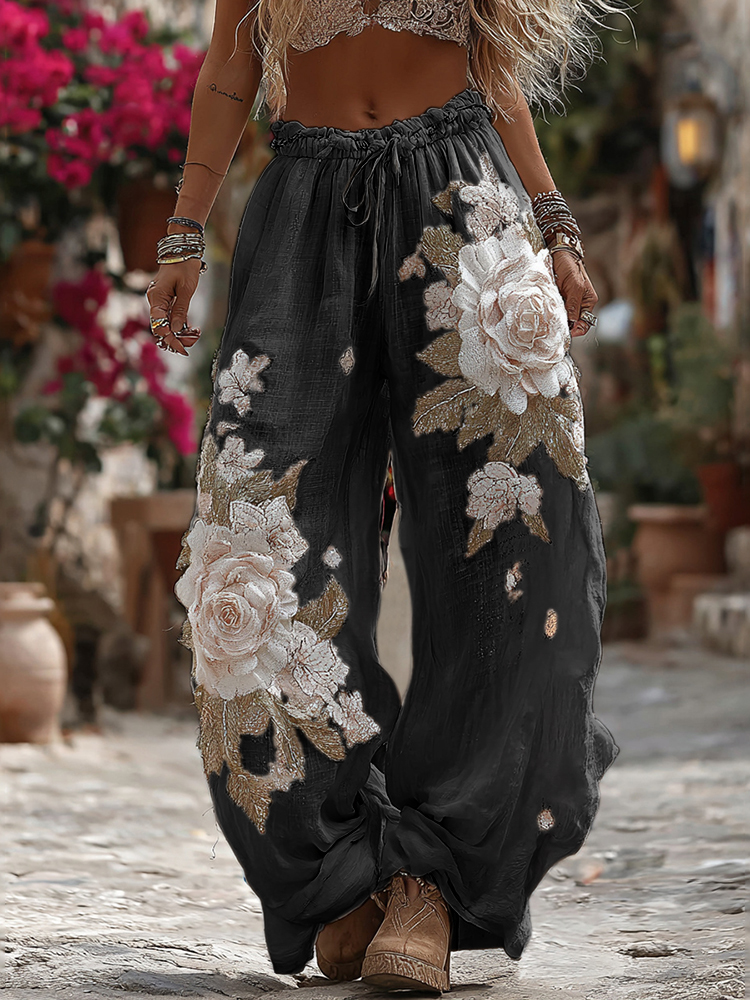 Women’s Vintage Romantic White Rose Embroidery Art Comfy Linen Pants