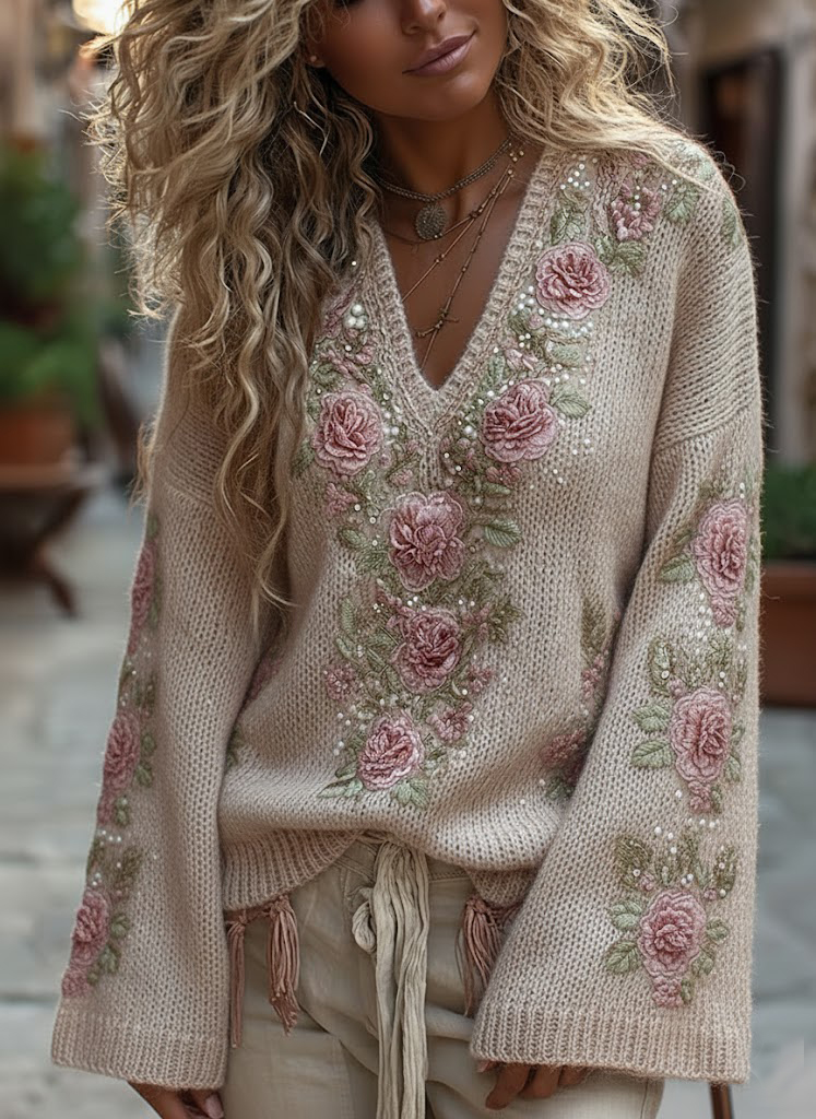 Women’s Vintage Rose Art Cozy Knit Sweater