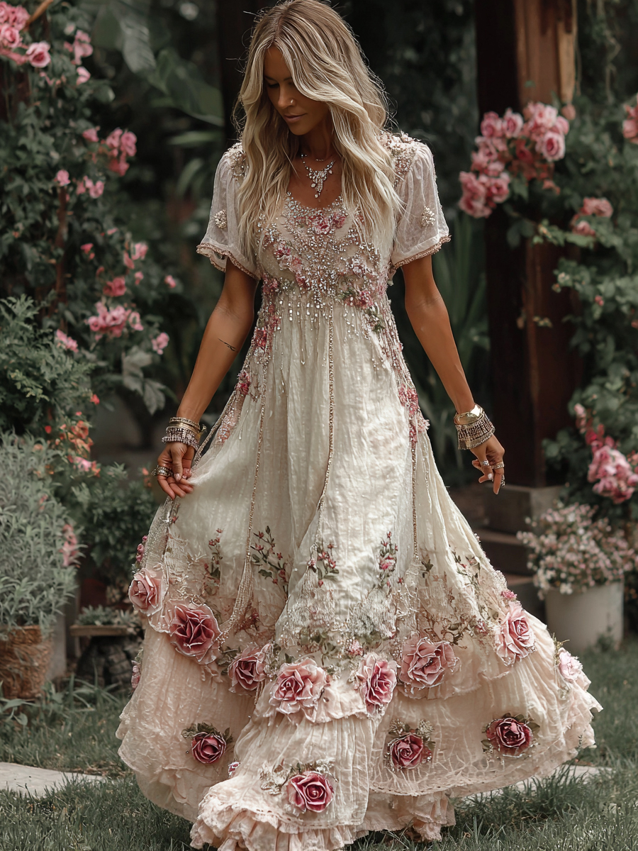 Women’s Vintage Rose Embroidery Art Round Neck Short Sleeve Maxi Dress