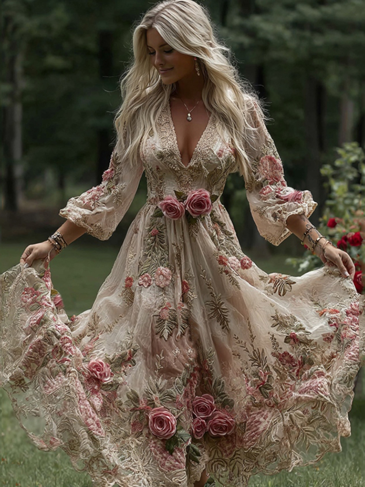 Women’s Vintage Rose Floral Embroidery Art Casual V Neck Maxi Dress