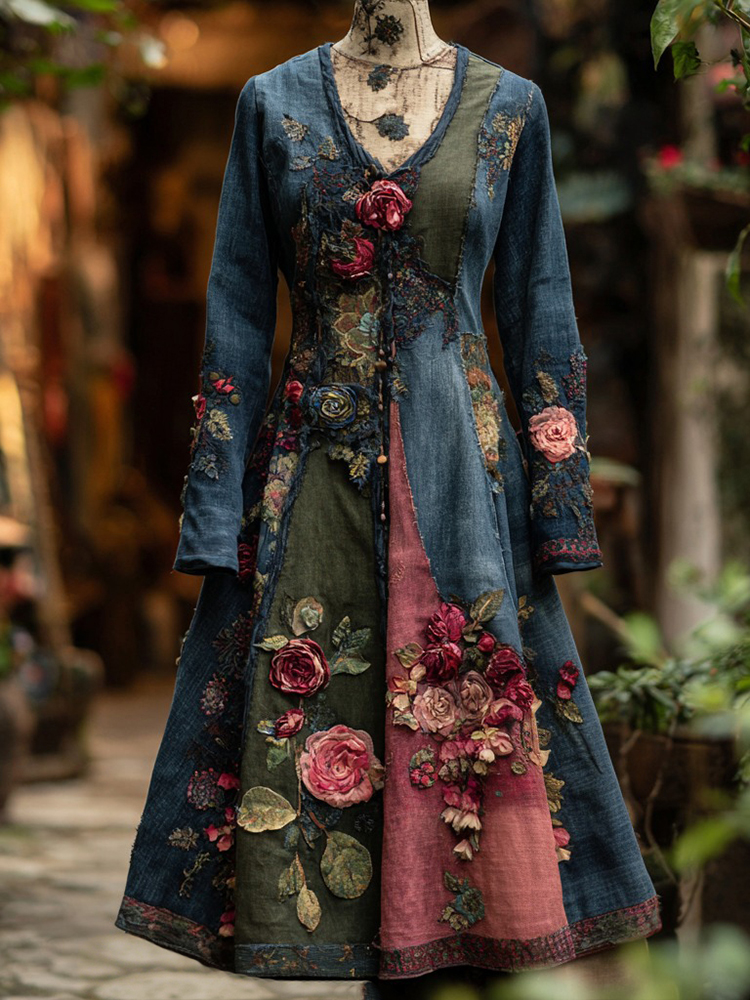Women’s Vintage Rose Floral Print Patchwork Denim Long Dress