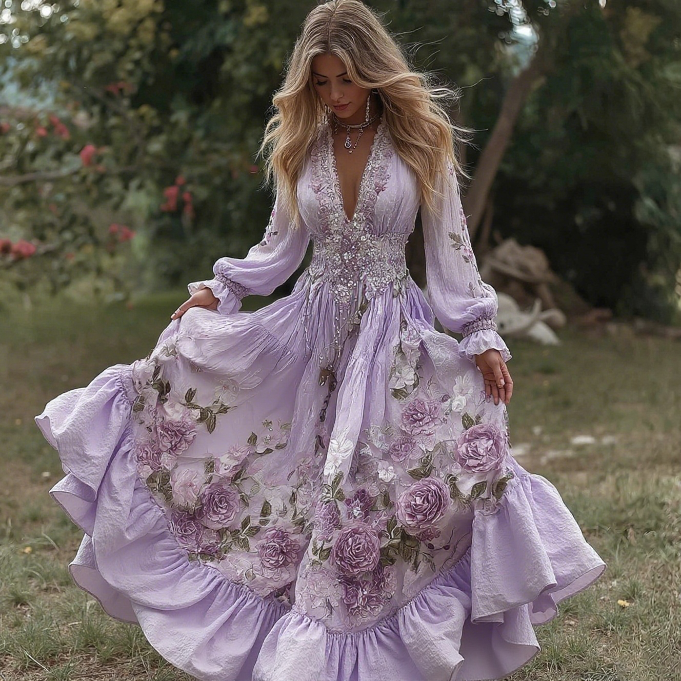 Women’s Vintage Roses Embroidery Art V-neck Long Sleeves Maxi Dress