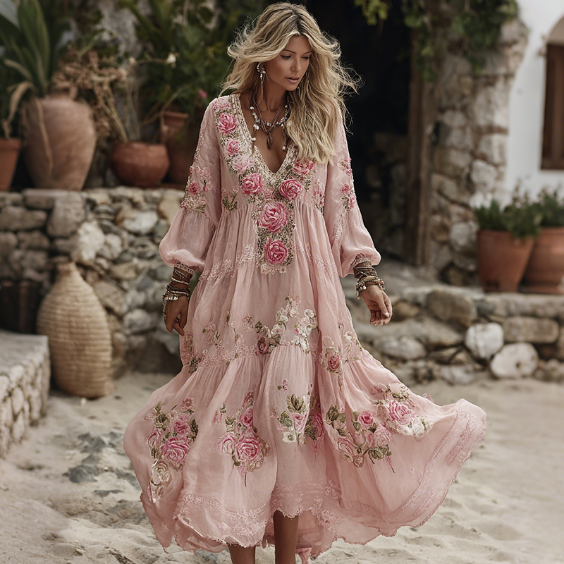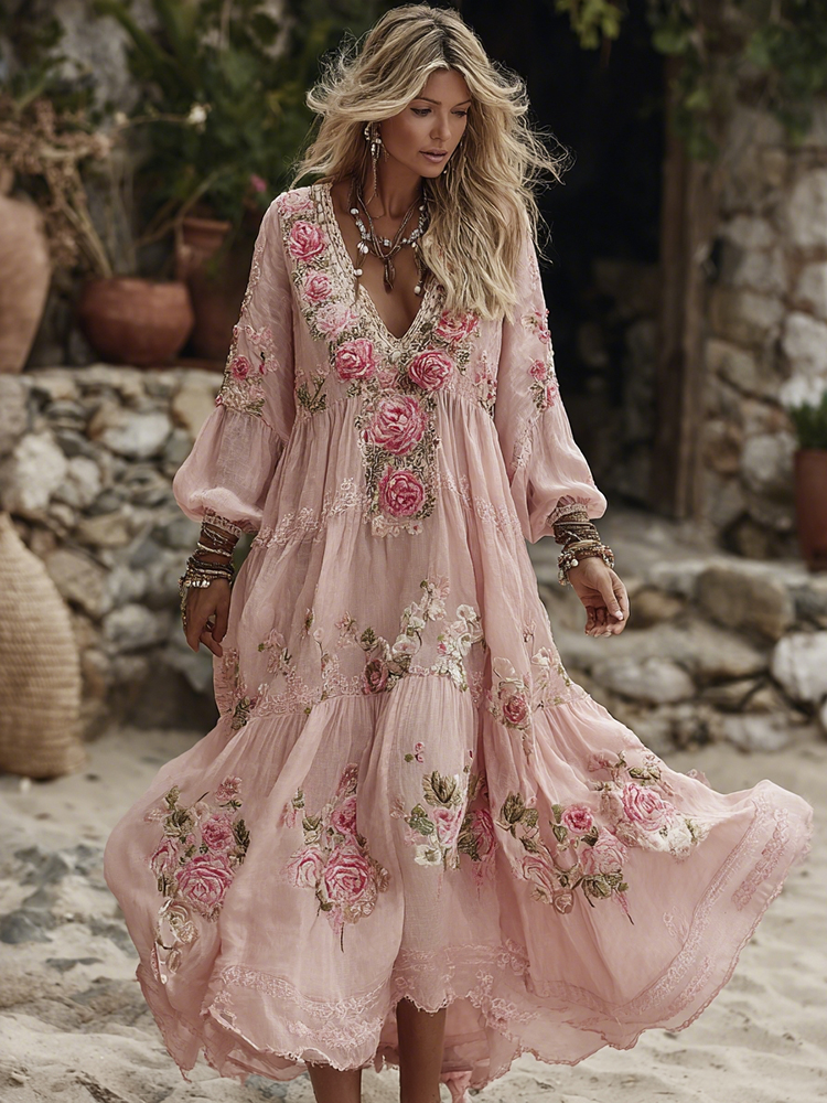 Women’s Vintage Rose Embroidery Art Comfy Linen Maxi Dress