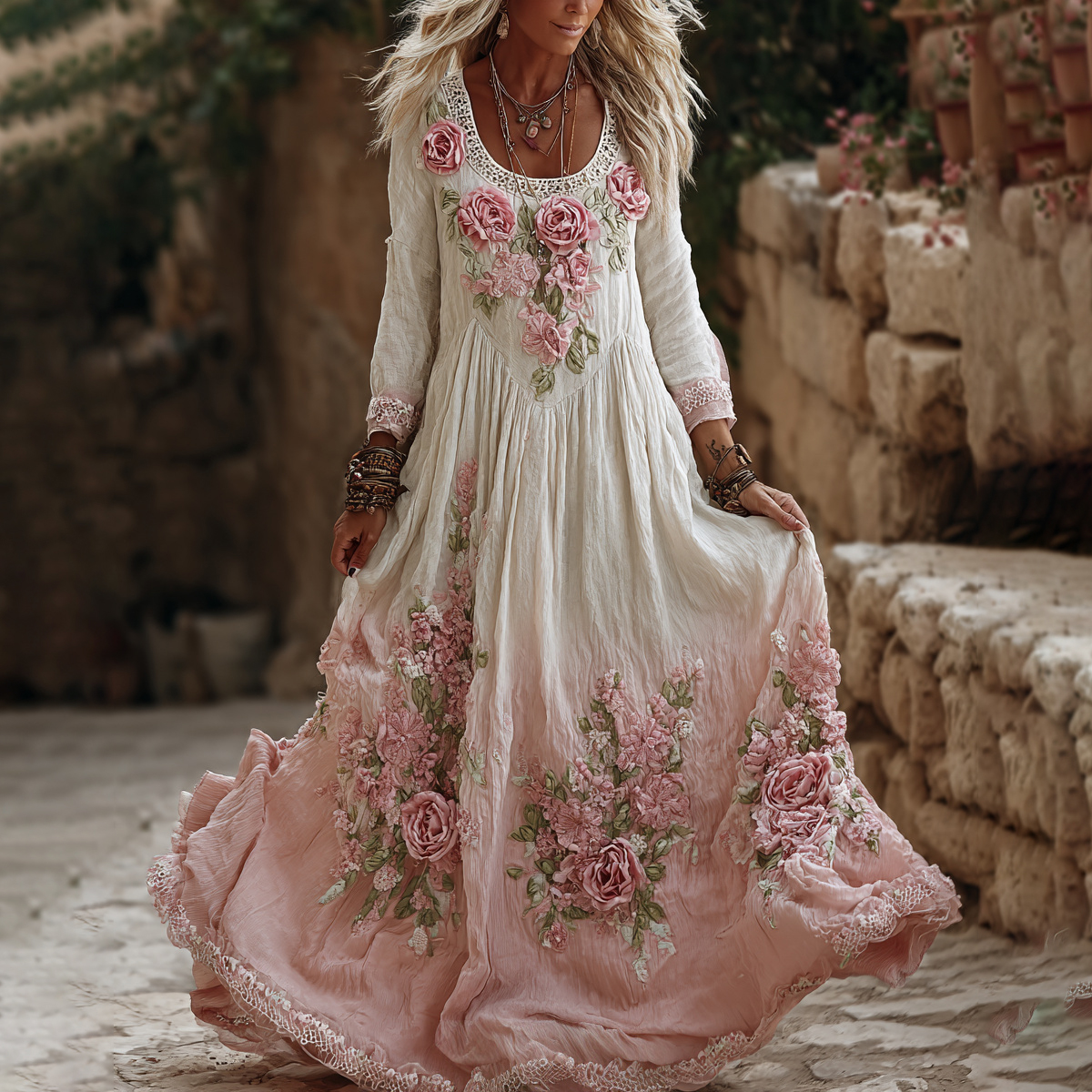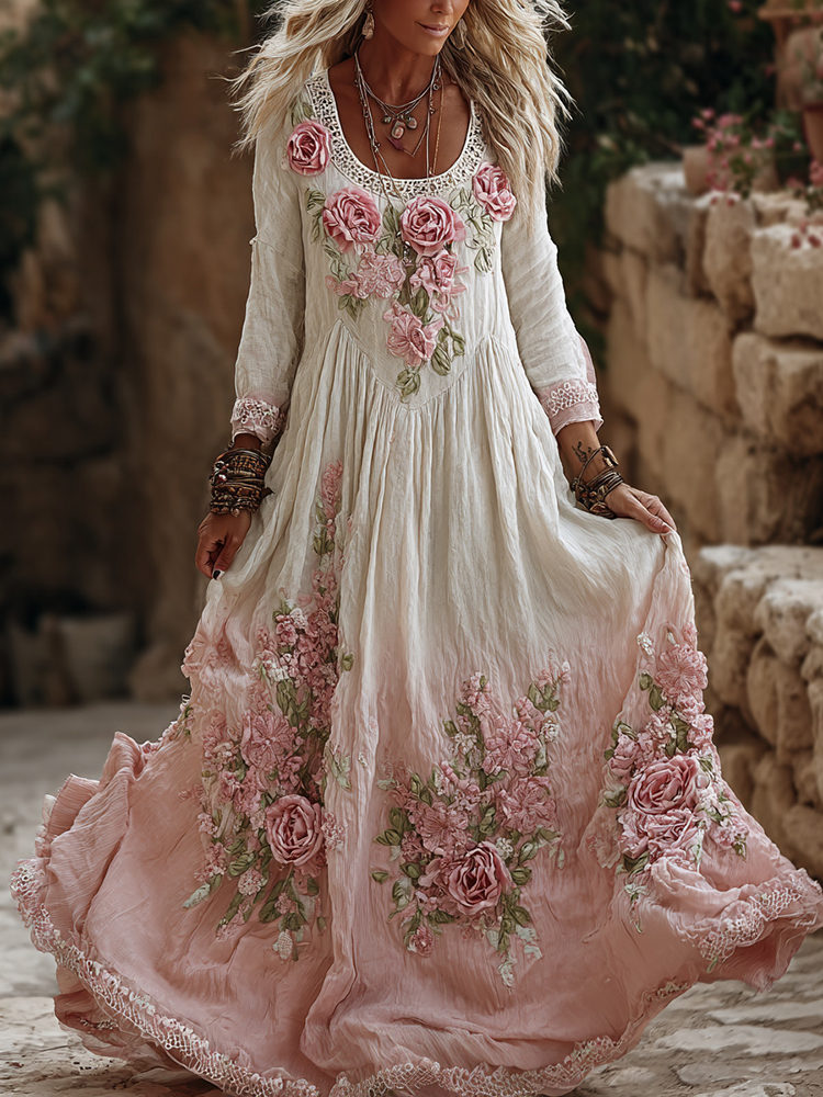 Women’s Vintage Roses Lace Art Flowy Linen Maxi Dress