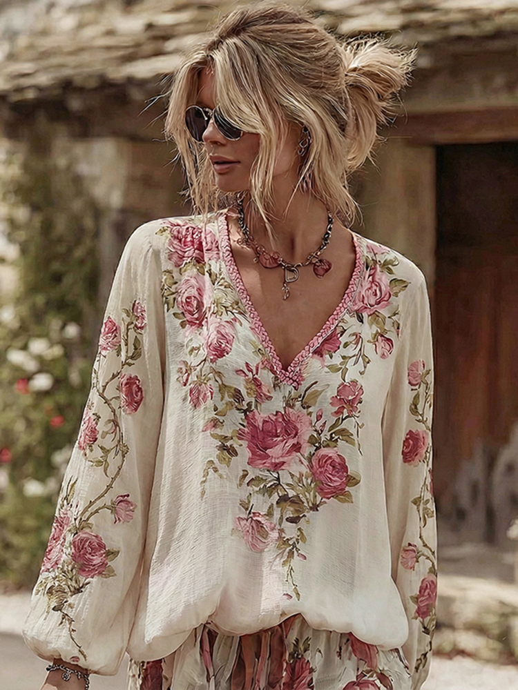 Women’s Vintage Roses Print V-neck Linen Blend T-shirt