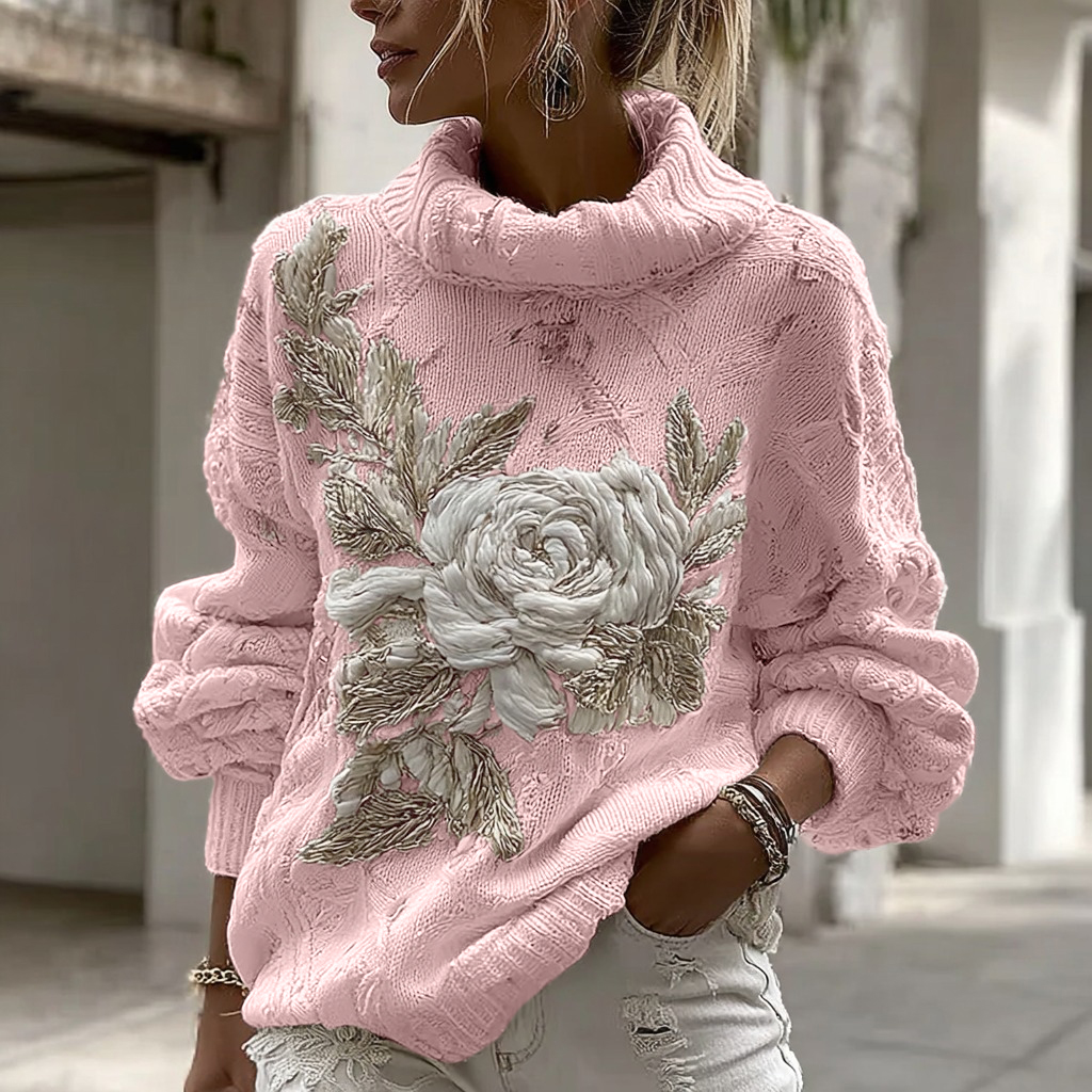 Women’s Vintage White Rose Chunky Knit Turtleneck Sweater