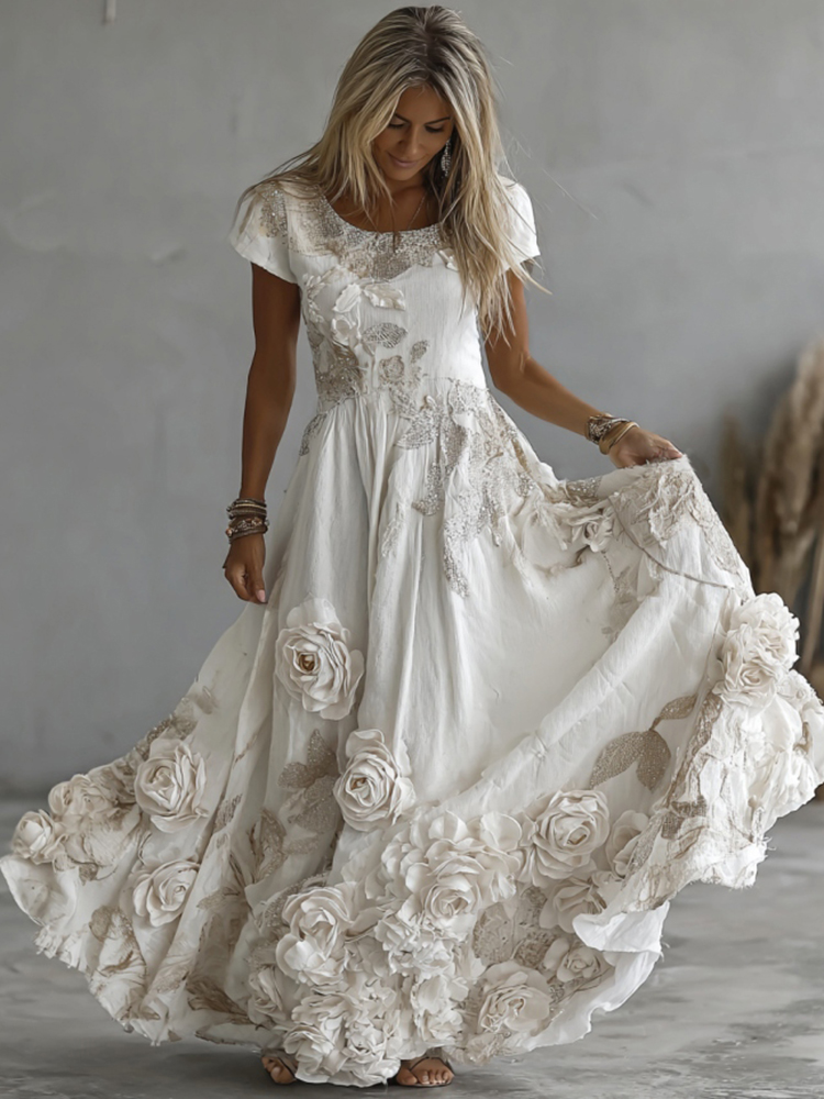 Women’s Vintage White Rose Embroidery Art Round Neck Short Sleeve Maxi Dress