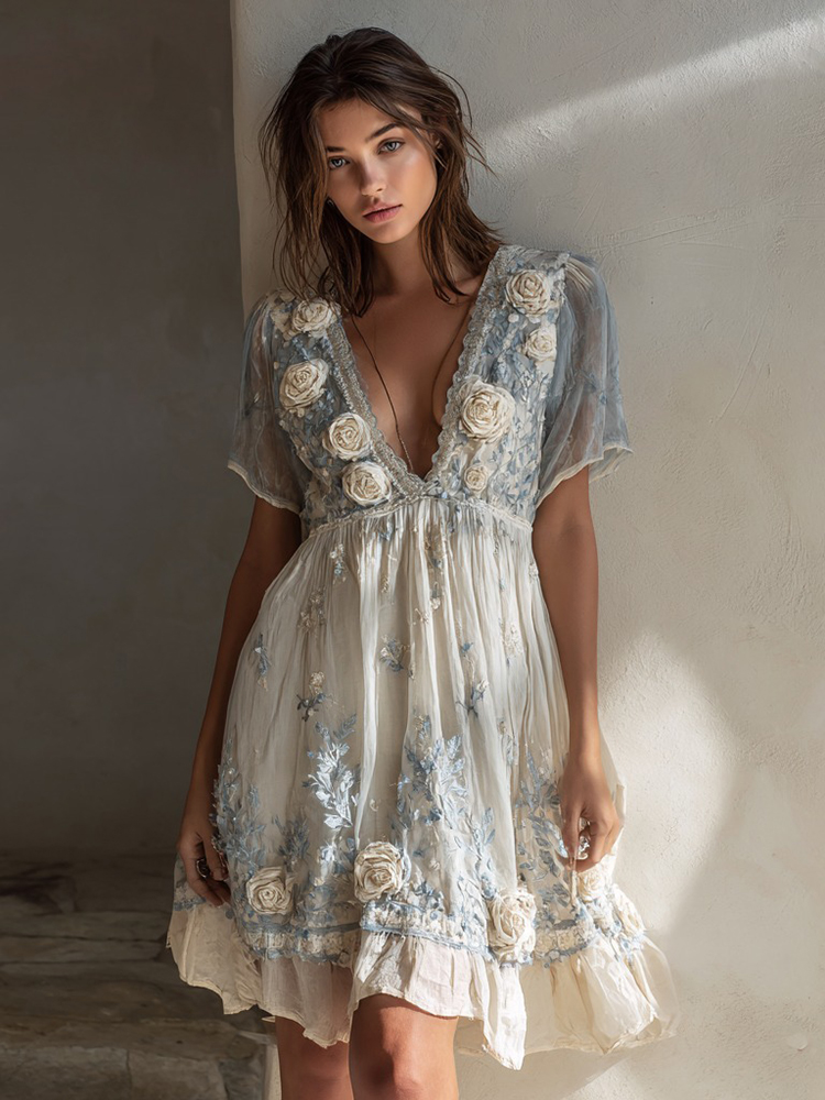 Women’s Vintage White Rose Gradient Pattern Linen V-neck Dress