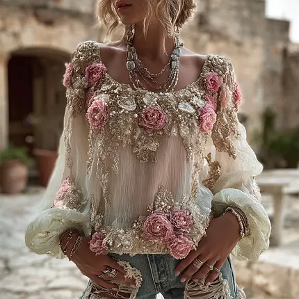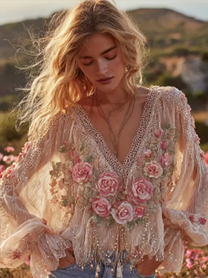 Bohemian Pink Rose Sequin Crinkle Romantic V-neck Long Sleeve Top