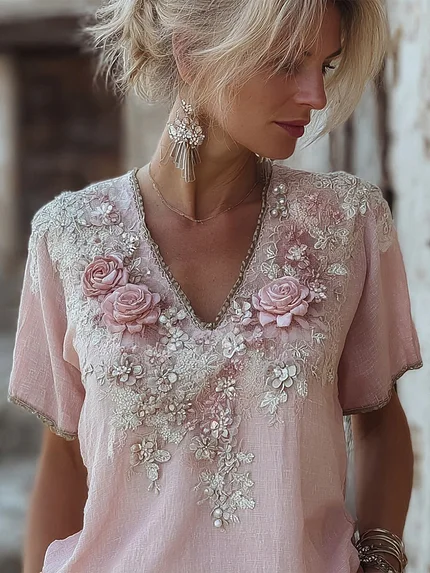 Boho Pink Roses Embroidered Short Sleeve Linen T Shirt