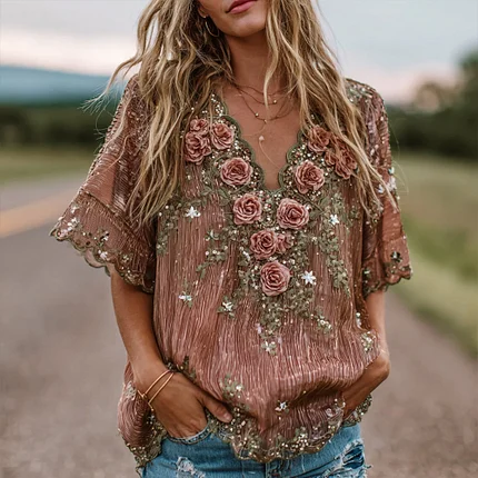 Vintage Bohemian Pink Rose Sequin Slightly Crinkled V-neck Short Sleeve Top