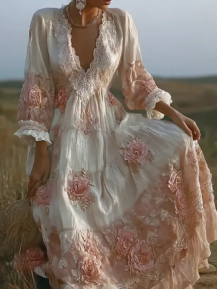 Retro Pink Rose Design V-neck Long-sleeve Casual Dress