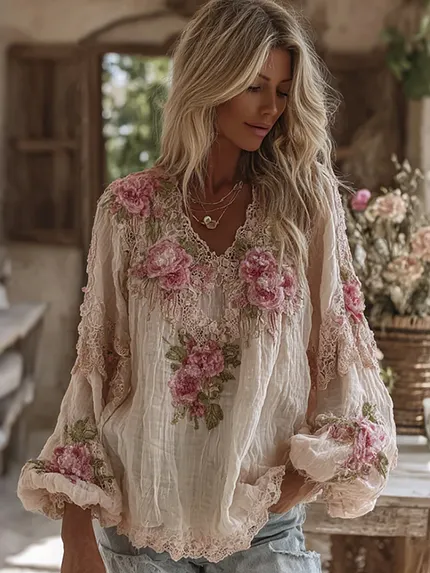 Women’s Vintage Pink Floral Art Print Flowy Linen Blend Casual V Neck Tops