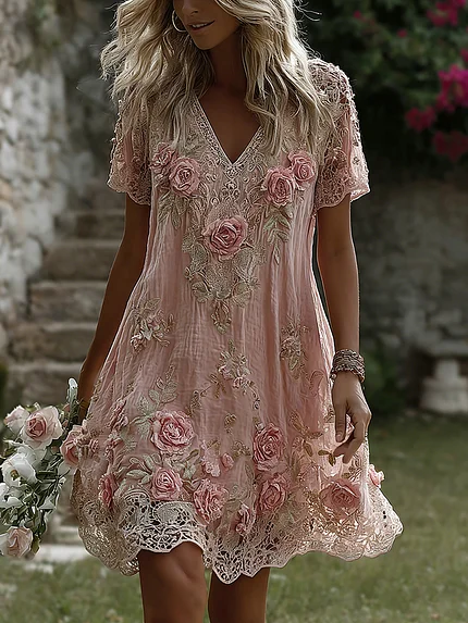 Women’s Vintage Floral Art Print Flowy Linen Blend Casual Short Sleeve Mini Dress