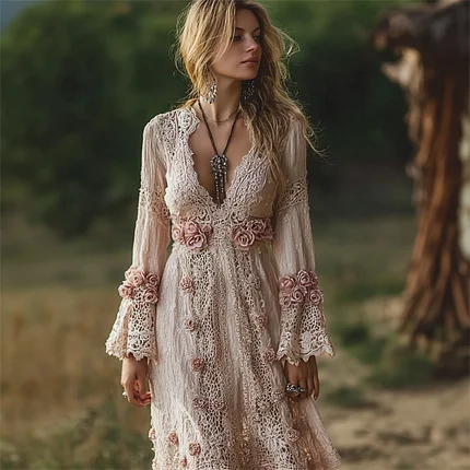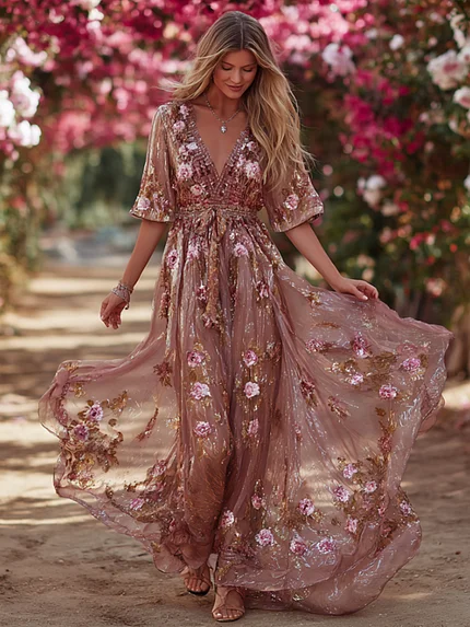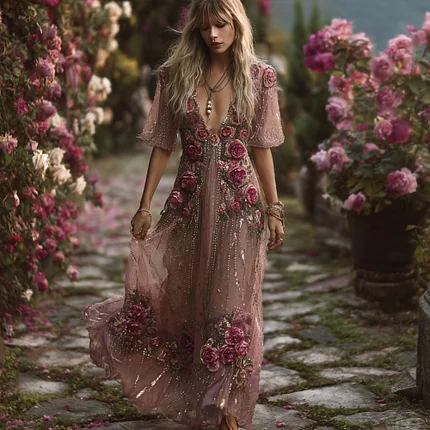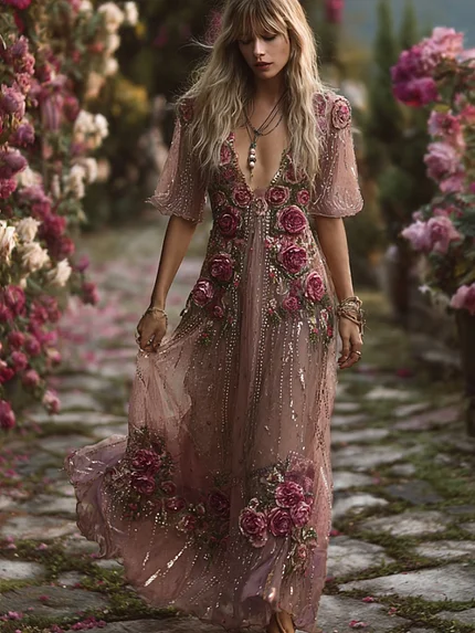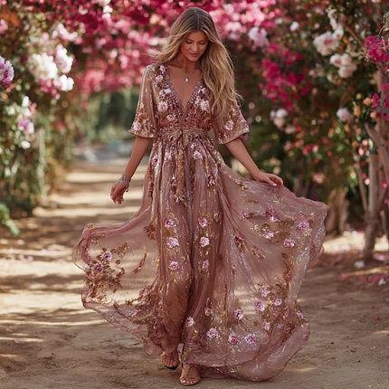 Women’s Bohemian Rose Embroidery Lightweight Dry Color Dress