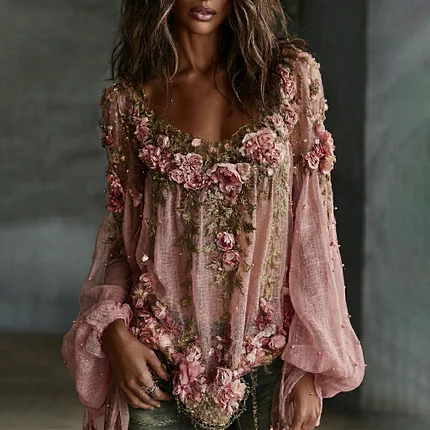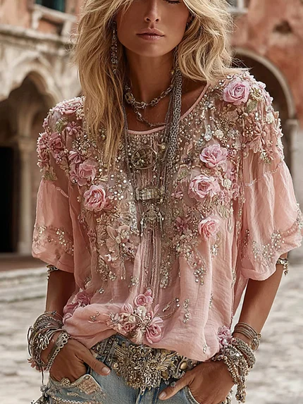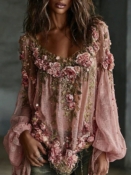 Women’s Romantic Floral Embroidered Art Print Flowy Linen Blend Casual Tops