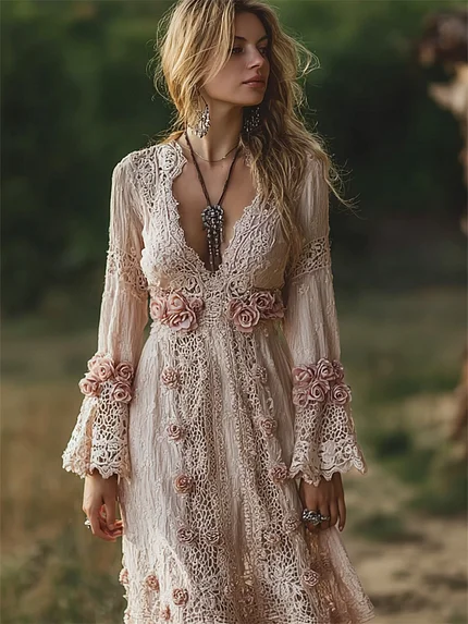 Vintage Boho Pink Roses Lace Art Linen Maxi Dress