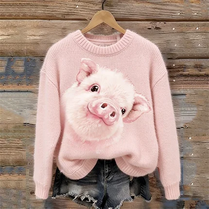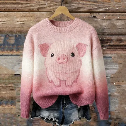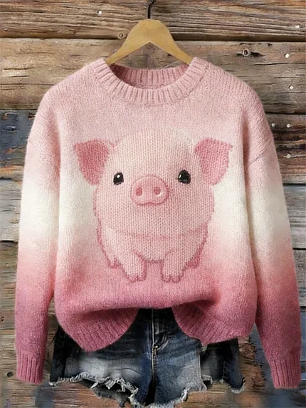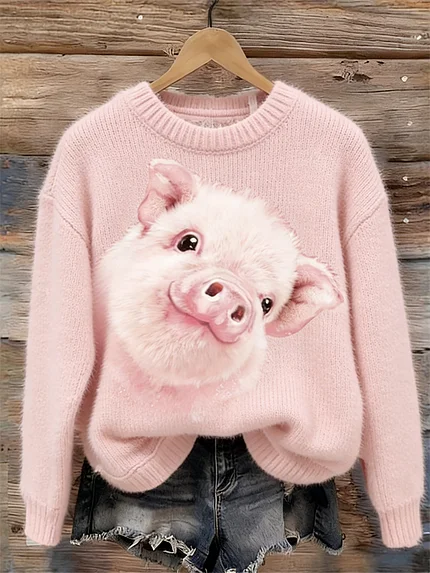 Lovely Pig Print Cozy Knit Sweater