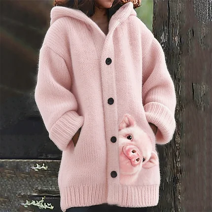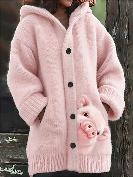 Lovely Peeking Pig Print Cozy Hooded Cardigan