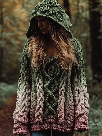 Women’s Vintage Cable Knit Embroidery Gradient Hooded Sweater