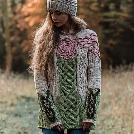 Women’s Vintage Floral Cable Knit Pattern Long-sleeved Sweater