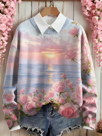Women’s Vintage Pink Flowers Art Cozy Knit Pullover Sweater