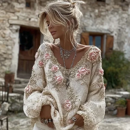 Elegant Pink Roses Beads Embroidered Cozy Knit Sweater